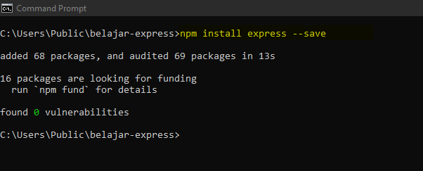 Buat folder baru dan inisialiasi project. Misal di sini nama foldernya 📁belajar-express