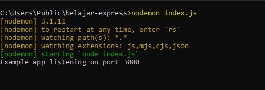 Ketika kita ubah kode dan cek kembali perubahannya, Express tidak akan langsung mengubahnya. Harus restart server agar perubahan bisa dibaca.